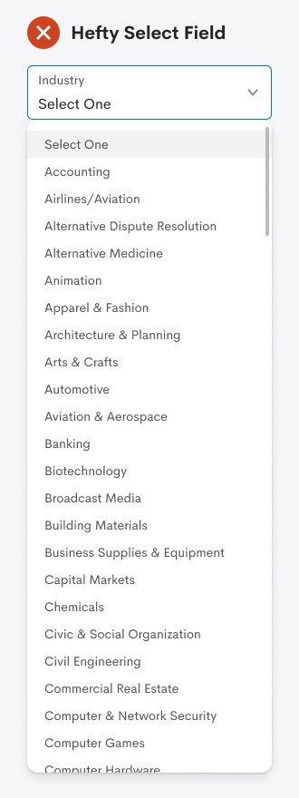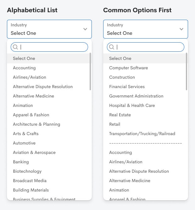 Кроме алфавитного порядка, сделайте самые распространённые варианты наиболее доступными и разместите их в верхней части меню. В примере ниже восемь отраслей с наибольшим процентом занятости расположены выше остальных. Это помогает большинству пользователей выбрать отрасль без необходимости прокрутки или ввода текста.