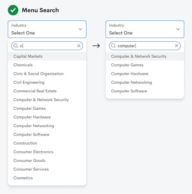 В поле выбора «Отрасль» (Industry) доступно 147 вариантов. Ввод одной буквы сокращает список и отображает варианты, которые начинаются с этой буквы. Чем больше пользователь печатает, тем короче становится список. Обратите внимание, как ввод буквы «С» сократил список со 147 вариантов до 15. Если человек введёт слово «Компьютер» (Computer), список сократится до пяти вариантов, и необходимость в прокрутке и поиске отпадёт.