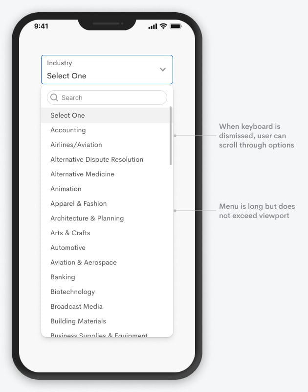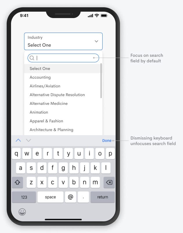 На мобильном устройстве при появлении фокуса клавиатура появится автоматически. Пользователь может скрыть её, нажав кнопку «Готово» (Done), чтобы выбрать вариант из меню. Тем не менее, поиск в меню должен всегда быть в приоритете, поскольку пользователь уже знает, что он ищет.