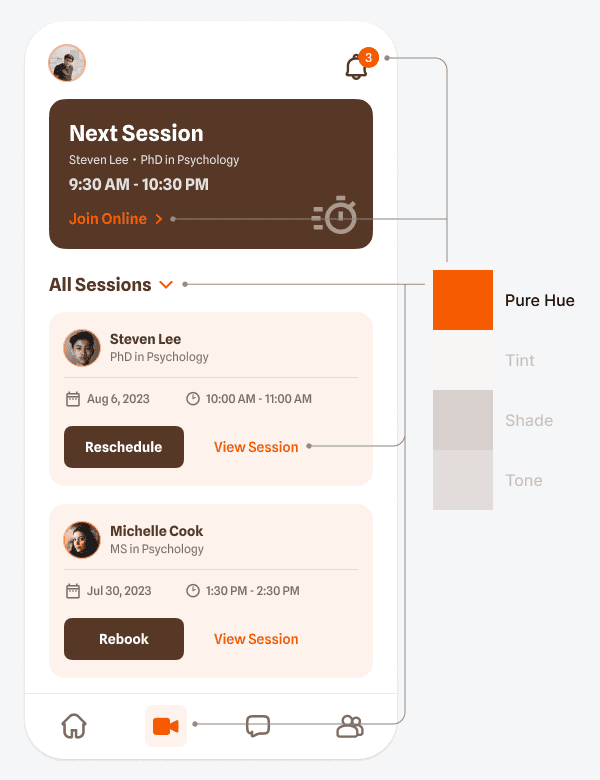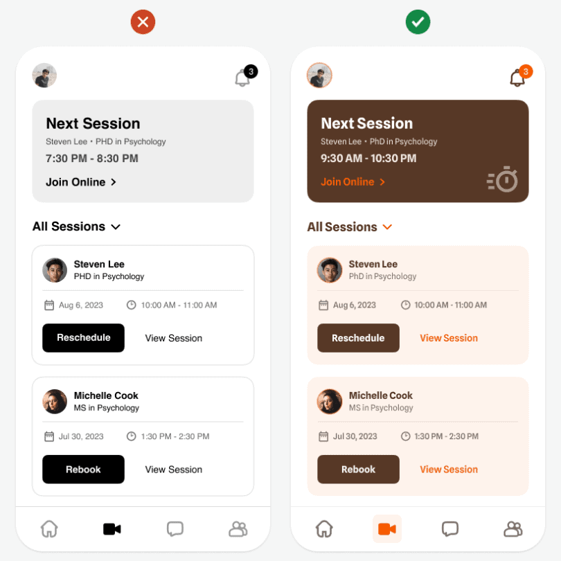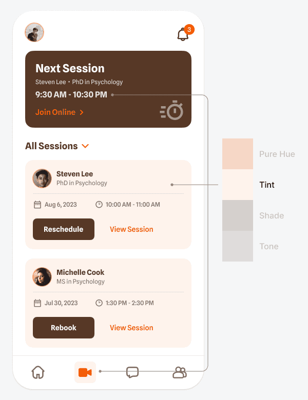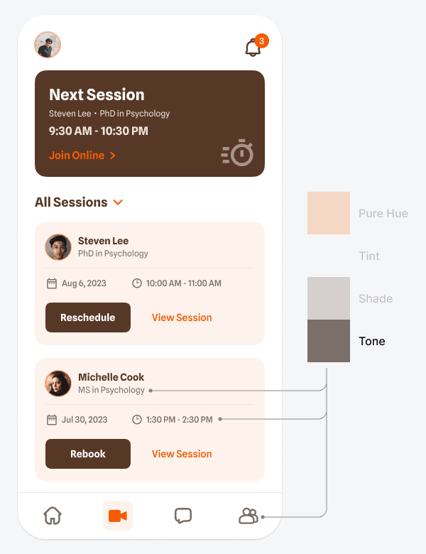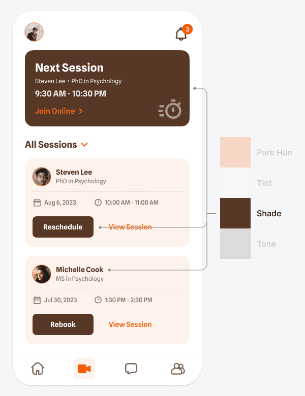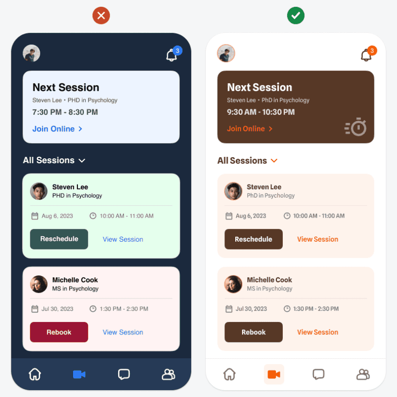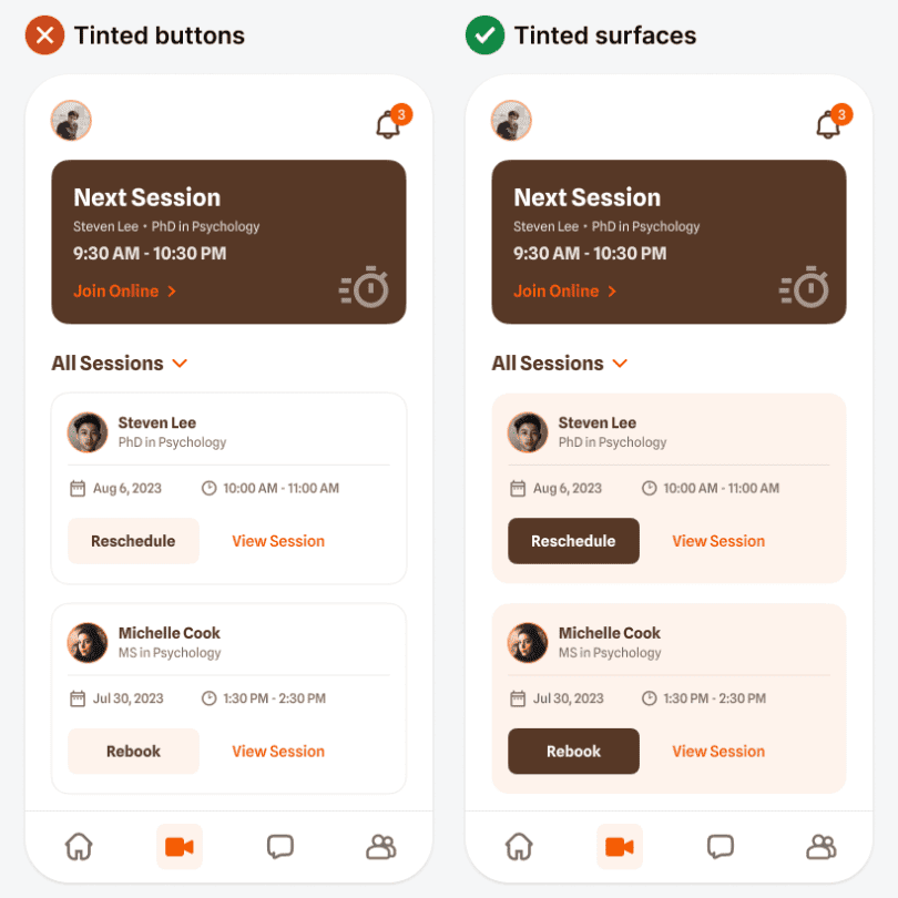 Также тёмный тон можно использовать для того, чтобы выделить элементы высокого приоритета в режиме тёмной темы. Например, в примере выше тёмный тон есть на карточке «Следующая сессия» («Next session»). Поскольку это самый важный элемент, этот тон позволяет выделить его на светлом фоне.