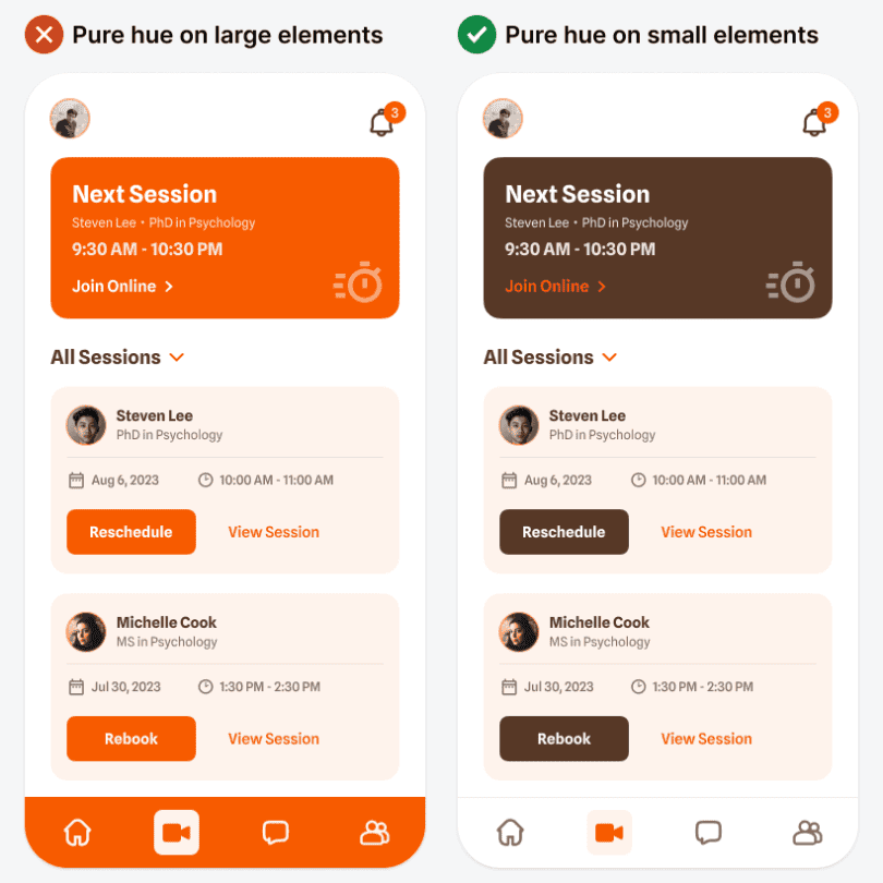 Обратите внимание, как в плохом дизайне оранжевый цвет кричит и требует внимания. Высокая насыщенность и чистота цвета делают его ярким. Поэтому используйте такие цвета дозированно, для небольших элементов. Думайте о чистом цвете, как о специи. Вы применяете его, чтобы подчеркнуть естественный вкус пищи, а не перебить его.