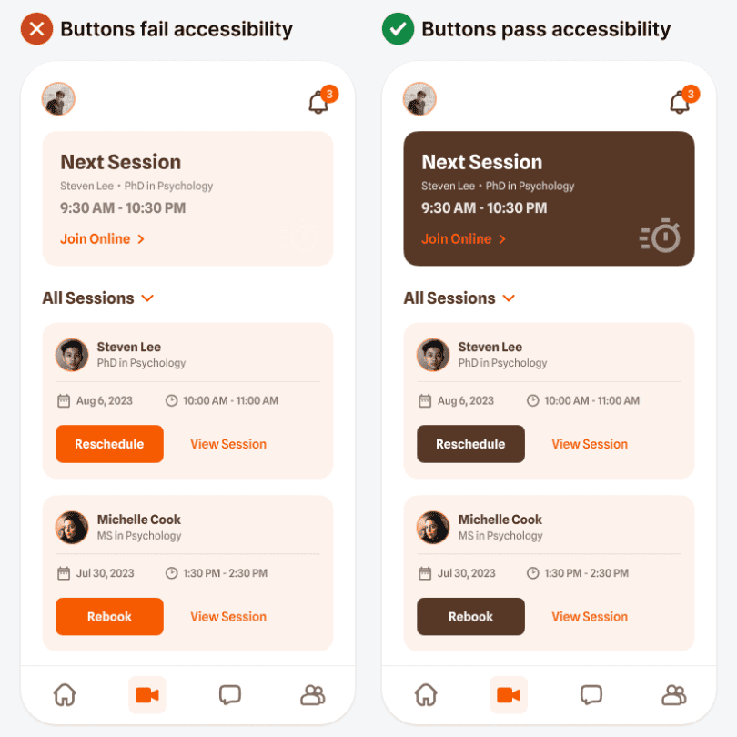 Тёмные тона позволяют сделать кнопки призыва к действию доступными для людей с нарушениями зрения. Если бы вы окрасили кнопки в чистый цвет, коэффициент доступности был бы неудовлетворительный. Однако кнопка с использованием тёмного тона поддерживает высокий контраст по отношению к белому тексту, и тем самым соответствует стандартам доступности.