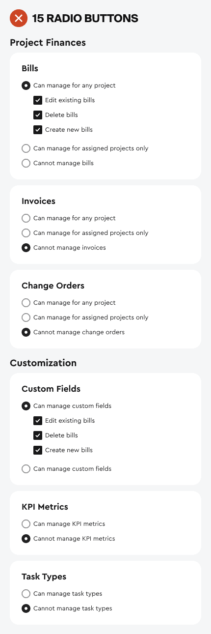 Если пользователь включает переключатель, появляется больше элементов. В таком случае можно применить настройку к двум условиям: «управление любым проектом» («manage for any project») или «управление только назначенными проектами» («manage for assigned projects only»).