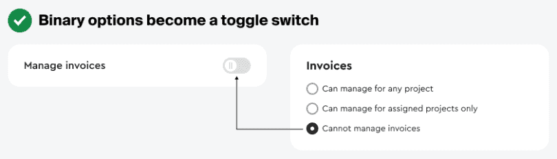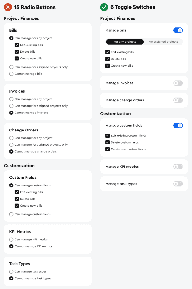 При выборе переключателя вам не придётся заставлять людей много читать или использовать множество элементов управления. Один переключатель помогает сократить многословные названия до одного краткого названия и количество радиобаттонов до одного элемента управления.