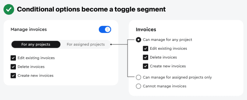Если вы сравните радиобаттоны и сегменты с переключателем, вы заметите, насколько понятнее стала логика. Названия более краткие, а варианты с условиями видны только при включенном состоянии основной настройки. Другими словами, если переключатель выключен, пользователи не увидят условную логику, потому что в данном контексте это не имеет смысла.