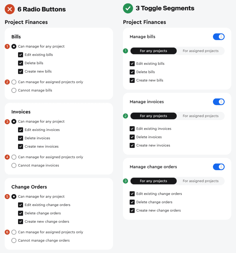 Вместо того чтобы скрывать двузначную и условную логику в списке, компоненты сегмента с переключателем хорошо их иллюстрируют. Если сравнить дизайн с 15 радиобаттонами и дизайн с 6 переключателями, вы увидите, насколько всё стало более упорядоченным.