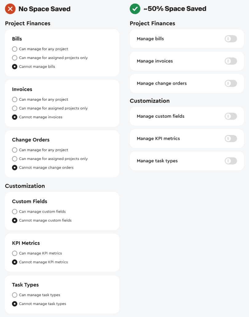 По сравнению с макетом с радиобаттонами, вы экономите примерно 50% вертикального пространства, при отключенных параметрах. Страница удлиняется, только когда пользователь активирует настройку. Поскольку большинство страниц с настройками довольно длинные, это существенное преимущество.