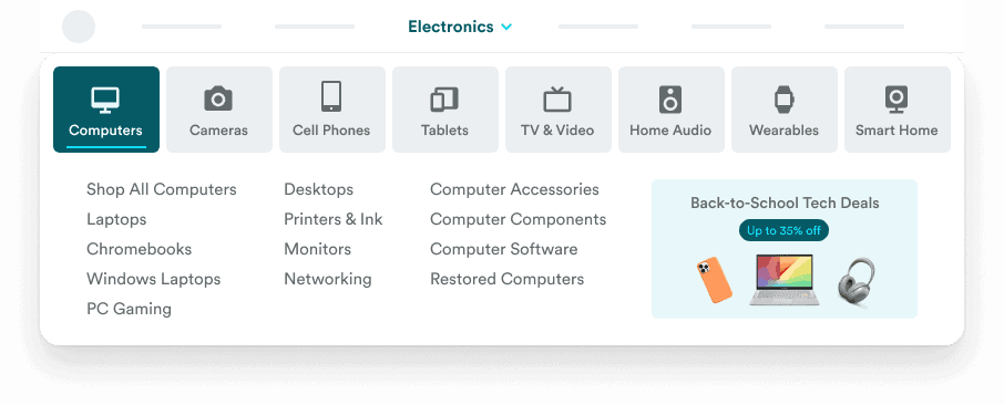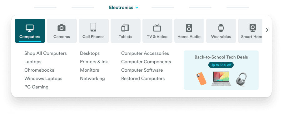 В меню «Electronics» список товаров находится слева, а рекламный баннер — справа. Реклама показывает скидки на технику, которые могут заинтересовать пользователей. Включение этого специального пункта в список усложнило бы его поиск и снизило коэффициент кликабельности. А его размещение вне списка позволяет большему числу пользователей увидеть и кликнуть по нему.