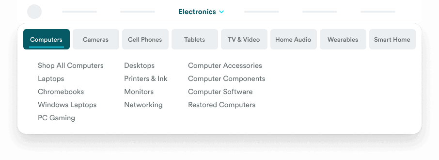 Решение об использовании иконок зависит от того, реальные ваши пункты или абстрактные. Легко подобрать иконки для меню «Electronics», потому что эти товары — реальные. Однако иногда могут встречаться более абстрактные вещи, поэтому используйте визуальные вкладки с иконками только тогда, когда есть такая возможность.