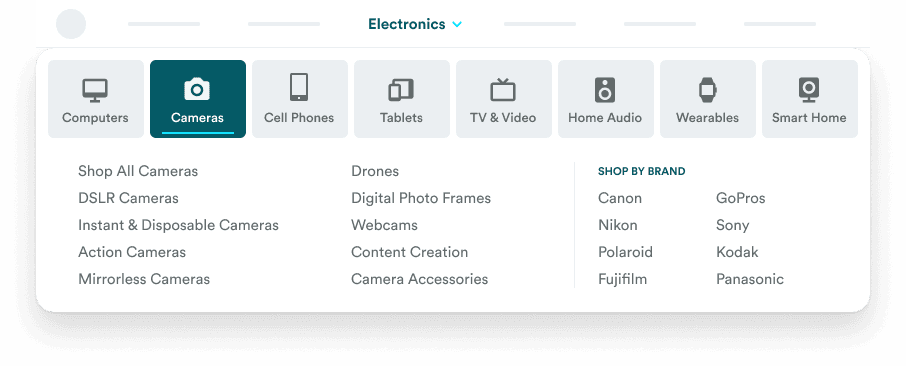 Вы также можете использовать это дополнительное пространство для навигации с помощью фильтров. Например, список фильтров «Shop by Brand» находится справа. Там пользователи могут выбирать камеры по названию бренда. Вместо того, чтобы переходить на страницу конкретного товара и выбирать фильтр, они могут сразу перейти на отфильтрованную страницу из меню.