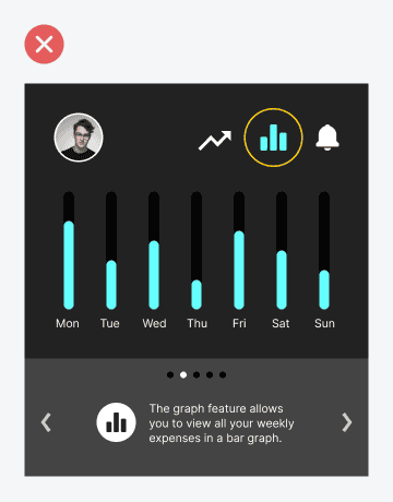Для знакомства с функциями приложения интерактивные подсказки подходят лучше, чем экран онбординга. Онбординги больше подходят для приложений, которым требуется доступ к личным данным или ресурсам пользователя, прежде чем последние смогут что-либо сделать.