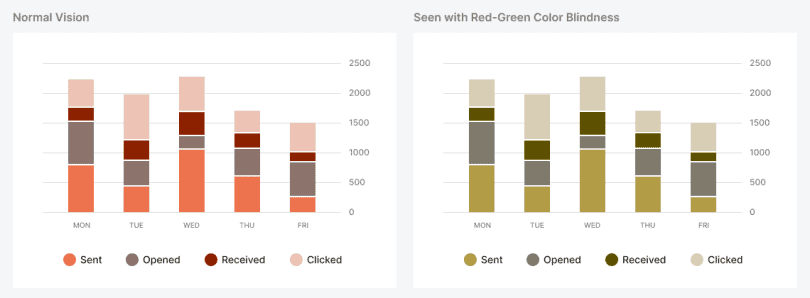 Ниже вы видите столбчатую диаграмму с разноцветными столбцами. Пользователям с нарушением цветовых ощущений в красно-зелёной области спектра (дейтеранопия или протанопия) будет трудно отличить три цветных сектора из четырёх, поскольку цвета будут слишком похожими.