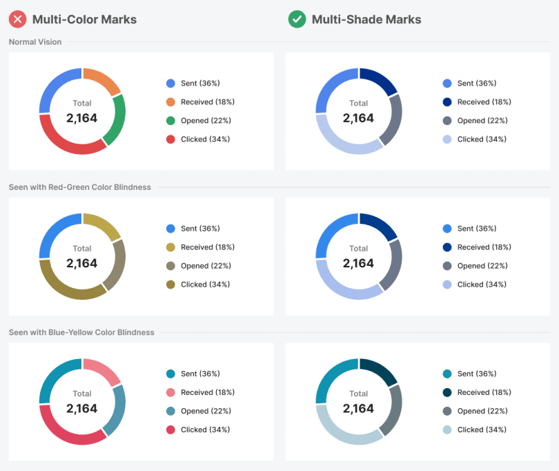 Чтобы сделать диаграммы доступными для людей с нарушением цветового зрения, не используйте разные цвета. Вместо этого возьмите один цвет и меняйте его насыщенность и яркость. Таким образом, вы создадите различные оттенки для одного и того же цвета, но при этом сохраните контраст. В результате люди с нарушением цветового зрения смогут отличать сектора друг от друга так же легко, как и пользователи с нормальным зрением.