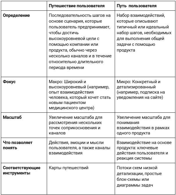 Основные различия между путешествием пользователя и путём пользователя представлены в таблице ниже: