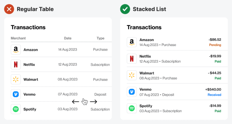 Применяя список в столбик и прогрессивное раскрытие, вы можете отобразить всю вашу таблицу на мобильном экране, независимо от размера данных. Это поможет эффективно использовать пространство и наглядно представить данные без лишней прокрутки или путаницы в контексте. Именно по этой причине список в столбик — лучший шаблон дизайна для отображения таблиц в мобильных интерфейсах.