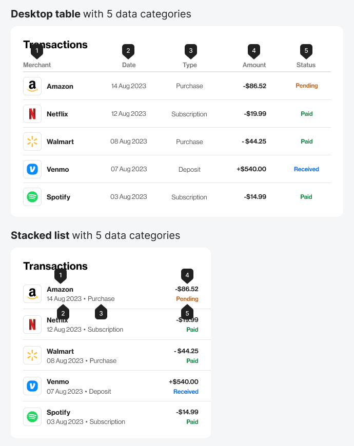 Чтобы продемонстрировать эффективность списка в столбик, рассмотрим таблицу из десктопной версии с пятью категориями данных и заголовками для столбцов. Список в столбик вмещает все пять категорий в ограниченном пространстве. Пользователям не нужны заголовки для столбцов, чтобы понять, что представляют собой данные. Это связано с их визуальной обработкой и размещением в столбик. В результате люди могут интуитивно интерпретировать категории данных без заголовков.