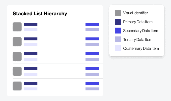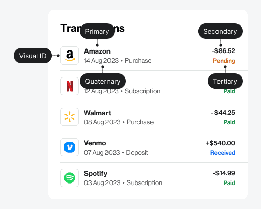 Анатомия списка в столбик обладает визуальной иерархией. Она начинается с визуального идентификатора на крайней левой стороне, такого как иконка или логотип основного элемента. Основной элемент находится в левой верхней части, за ним следует вторичный элемент в правой верхней части. Поскольку у этих двух элементов наибольший приоритет, их выделяют жирным шрифтом.