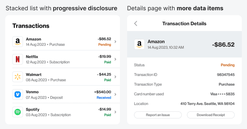 Для обозначения прогрессивного раскрытия отображайте стрелки раскрытия справа в виде визуальных подсказок. Когда пользователи прикоснутся к строке, они перейдут на другой экран с дополнительными элементами. В данном примере список в столбик представляет собой страницу, которая называется «Транзакции» («Transactions»), а последующая страница называется «Детали транзакции» («Transaction Details»).