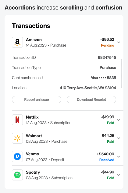 Аккордеон — шаблон, который некоторые дизайнеры выбирают для отображения таблиц в мобильных интерфейсах. Однако такой подход увеличивает количество вертикального скроллинга со стороны пользователей, потому что дополнительные элементы накладываются на предварительно просматриваемые. По мере того как пользователь открывает несколько аккордеонов, структура экспоненциально растёт.